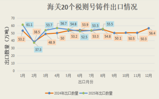 根据海关数据统计,2025年1-8月我国铸件出口数量同比增长,20个税则号出口总量423.5万吨,同比增长4.3%;出口总额117.8亿美元,同比增长3.8%。对美国出口93.4万吨,同比增长3.